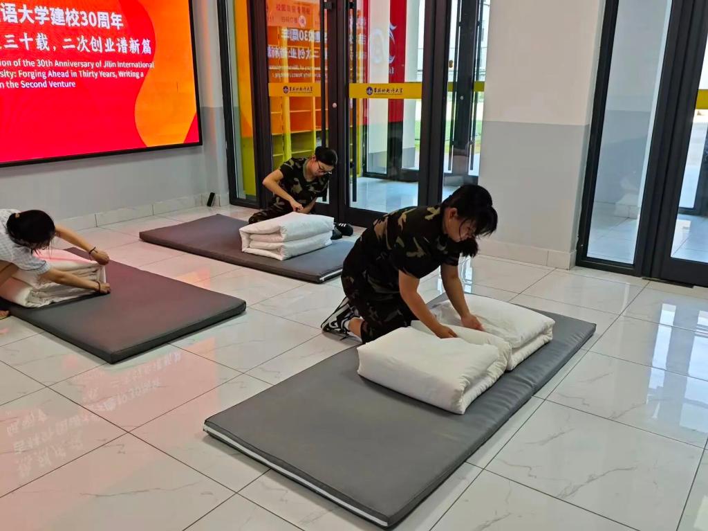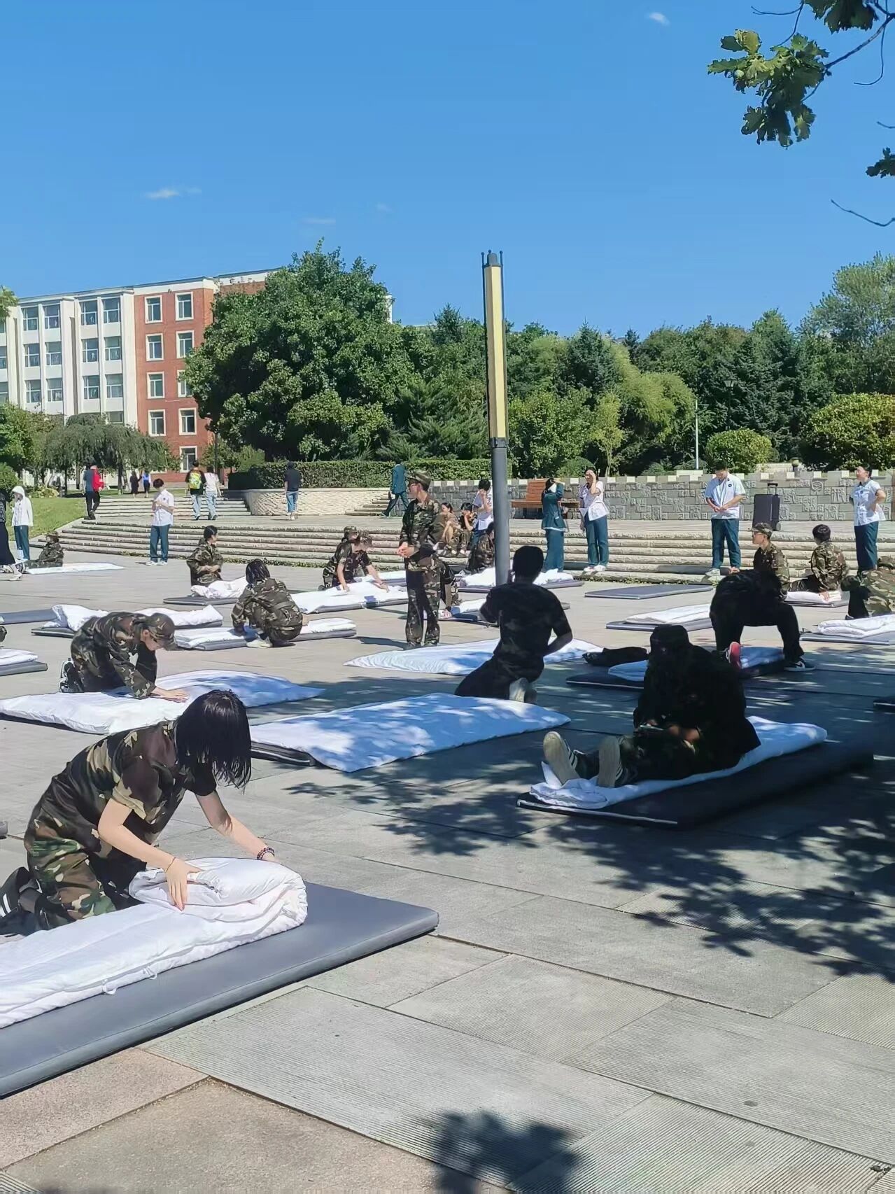 在2025级新生军训期间,为培养学生良好的生活习惯,增强自律意识,展现军训成果,教育学院在宿舍一楼大厅举办了一场精彩的叠军被大赛。此次比赛吸引了众多新生参与,为紧张的军训生活增添了别样的色彩。
