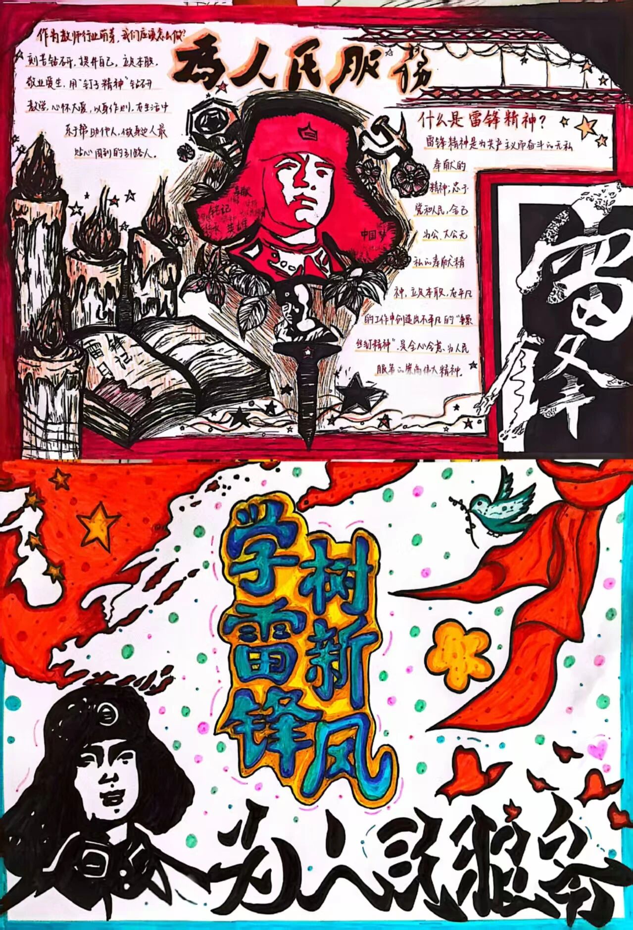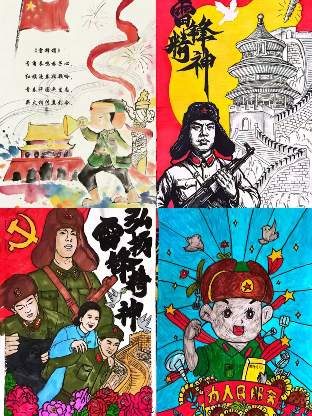绘画作品:将雷锋形象与红色元素、童趣图案结合,庄重而不失活泼,体现了将红色精神转化为儿童易懂形式的专业思考。