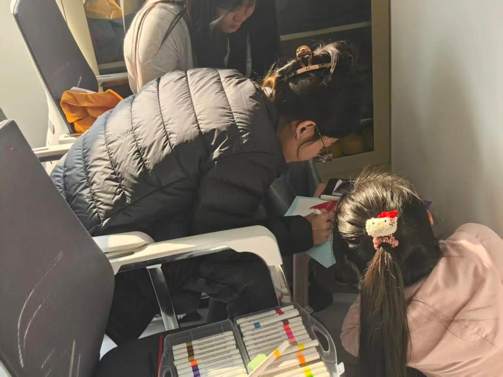 在公寓活动室开展红色绘本与多语言有声书创作实践。活动坚持“零基础可参与、有基础能发挥”,提供全流程指导: