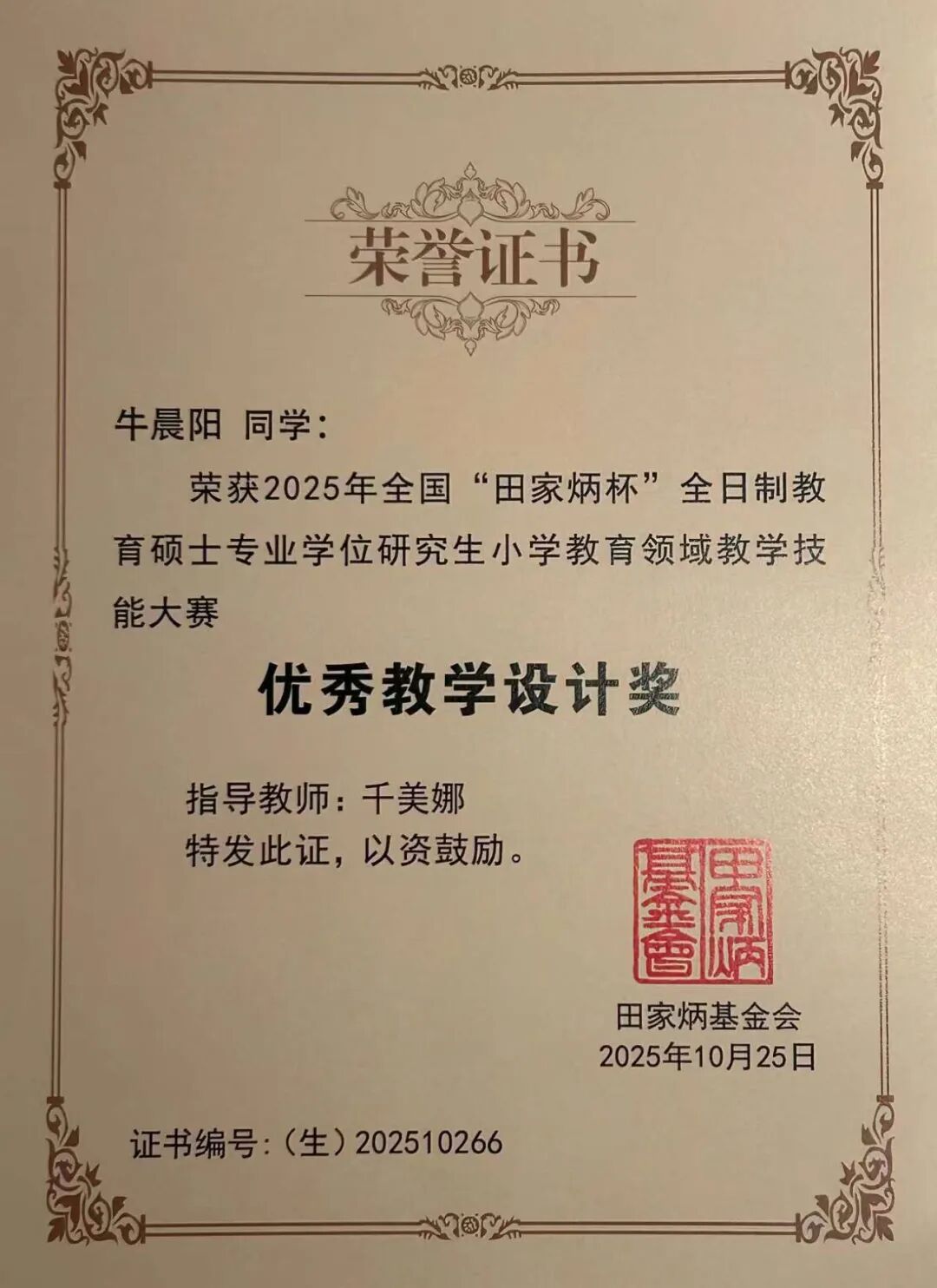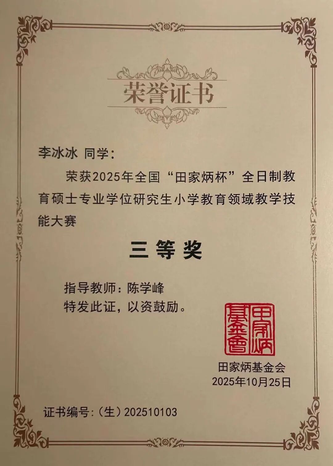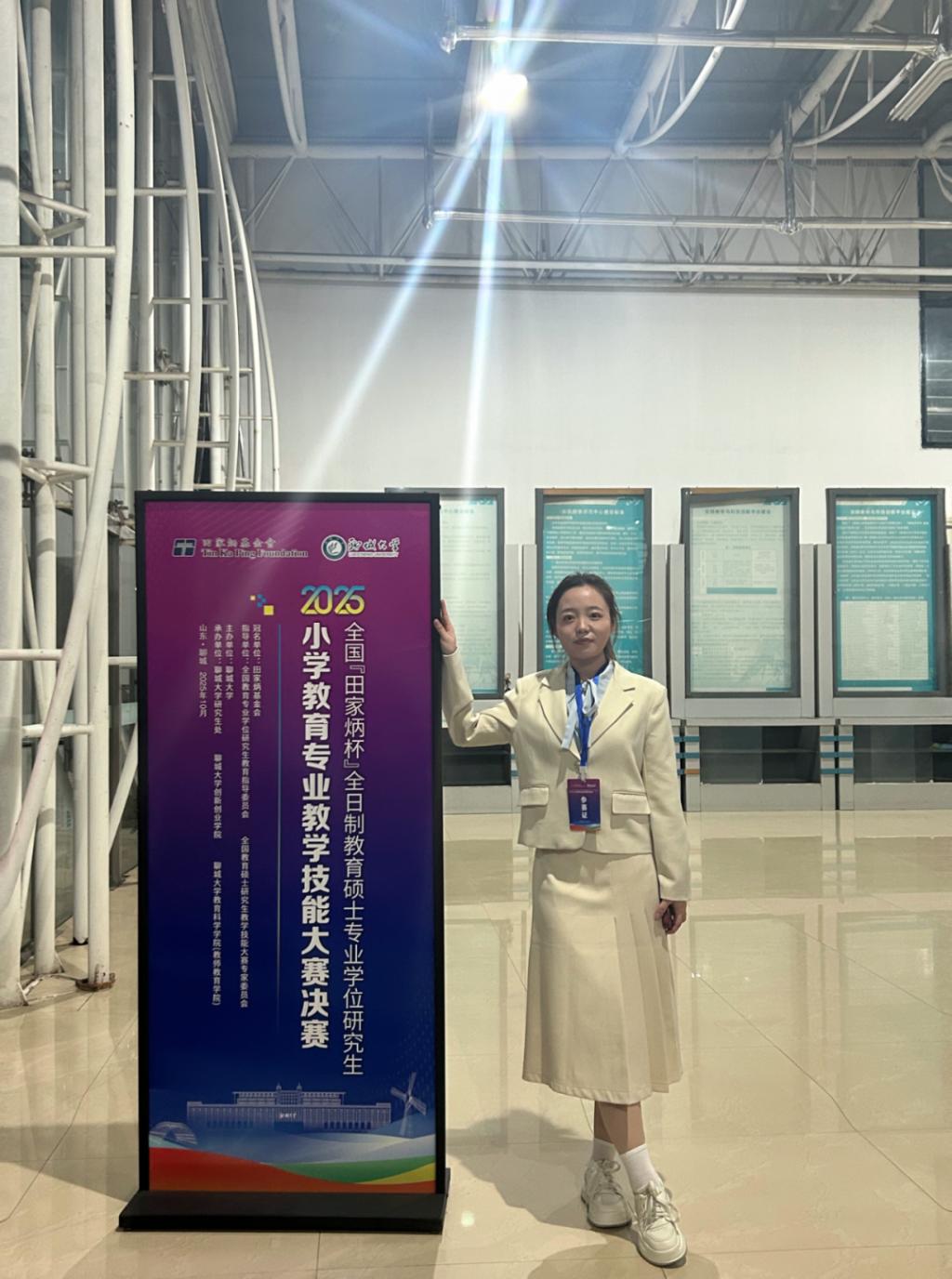 2025年全国“田家炳杯”全日制教育硕士专业学位研究生小学教育专业教学技能大赛决赛于10月25日-26日在聊城大学圆满举办。我院小学教育专业4名研究生在赛事中表现亮眼,预赛入围人数在吉林省位列第二、省属学校第一,决赛中李冰冰、曾淳斩获小学语文三等奖,黎海雯荣获小学英语三等奖,牛晨阳荣获小学英语优秀教学设计奖,创下小学教育专业在国家级赛事中获奖最多的纪录,尽显我院学子的教学实力与专业风采!