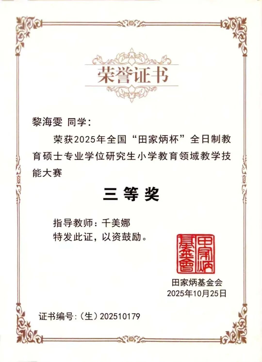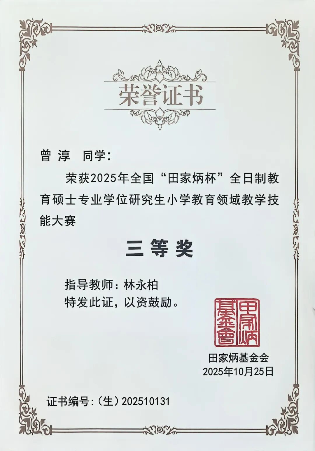 携三尺讲台之梦,赴全国竞技之约。此次代表学校站上“田家炳杯”全国小学教育专业硕士师范技能大赛决赛舞台,我倍感荣幸。备赛时,从教材语篇的深刻理解、教学活动的精心设计,到逐字稿的字斟句酌、课堂师生互动的反复推演,每一步都磨出了成长;赛场之上,与全国优秀选手竞技让我收获颇丰。我不仅学会了更精准把握小学课堂的“生成性”教学契机,更深刻理解“师范技能”不仅是教学设计能力,更是以学生为中心、用爱心与耐心贴近学生的教育初心。这次比赛是认可、是起点、是鞭策,让我明白教育不是照本宣科的理论,而是把课本读透、把理念用活、把课堂讲暖的实践。未来走上讲台,我会带着这份收获,认真对待每一堂课、每一个孩子。