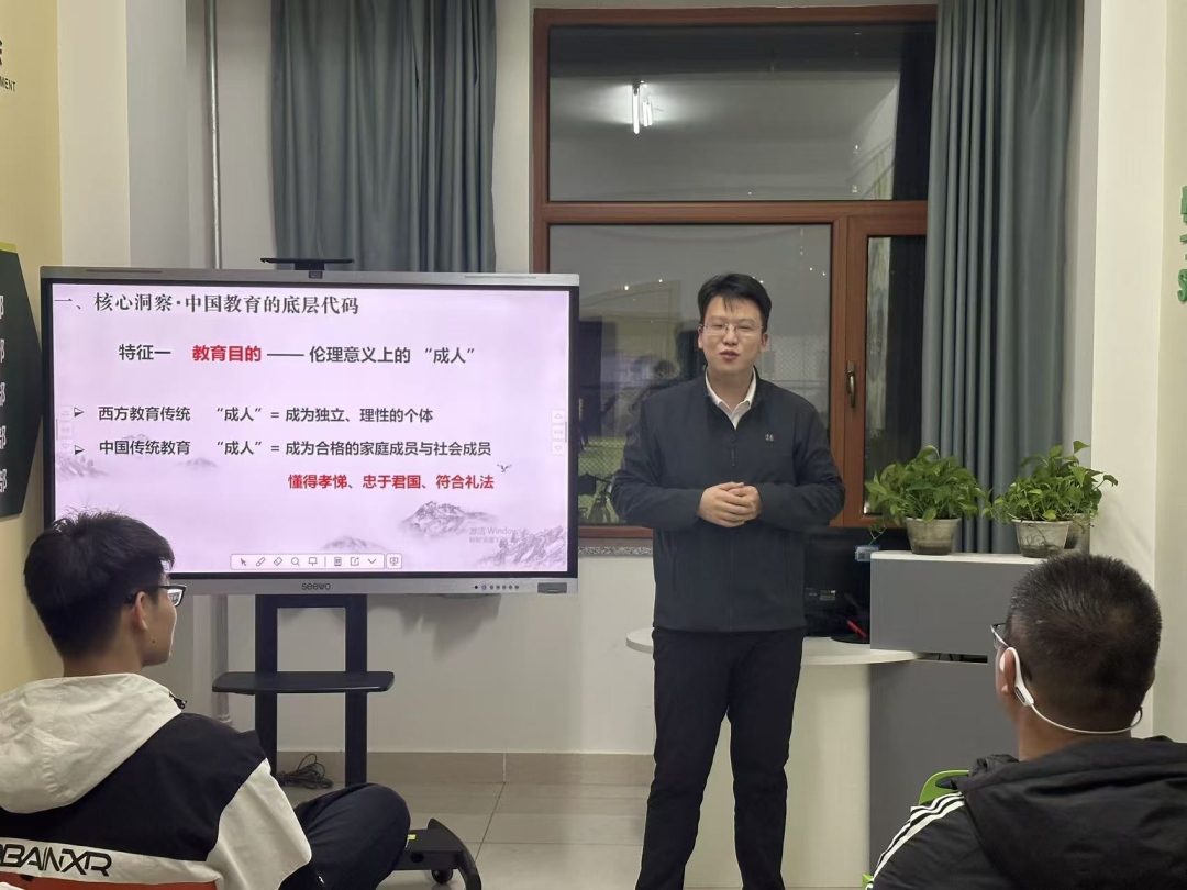 分享过程中,主讲人系统阐释了中国教育的三大核心底层代码,点明传统教育以伦理意义上的“成人”为目标、以社会阶层流动为核心动力、以经典传承阐释为主要方法的鲜明特征,对比中西方教育传统的本质差异,让大家清晰把握中国教育的文化根基;深入解读科举制度的一体两面,既肯定其打破世袭垄断、实现社会公平流动的伟大历史贡献,也揭示其导致思想趋同、割裂主流教育与科技创新的深层悖论;更直面当代教育的现实撕裂,剖析传统选拔逻辑与现代培养逻辑的激烈冲突,解读素质教育与应试升学、通识培养与学历筛选、批判性思维与标准答案的矛盾困境,让同学们深刻理解,当代教育的阵痛是文明转型的必然代价,而非单纯的制度问题。同时,主讲人也提出文化基因创造性转化的破局之道,倡导唤醒儒家修身、道家自然、佛家明心的传统教育本真,重构“成人”内涵、重塑现代师生关系、融合本土与现代教育理念,为教育转型指明可行路径。