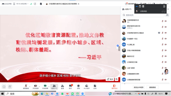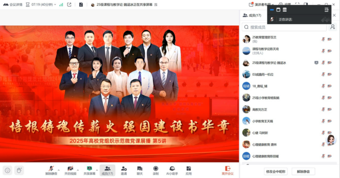 2025年10月17日16时,教育学院学生第四党支部以线上会议的形式开展专题党课学习,全体党员共同研读2025年10月17日播出的第5讲《提升民生保障力,办好人民满意的教育》党课内容,在思想碰撞中凝聚教育报国的青春共识。