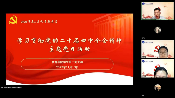 会议由党支部副书记江润海同志主持,简要介绍了本次党日活动的主题,并强调了学习贯彻党的二十届四中全会精神的重要性,特别是作为新时代青年党员,如何理解和践行全会精神。