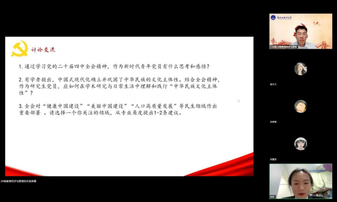 1. 新时代青年党员的责任与担当:党员们围绕新时代青年党员如何理解和践行全会精神进行了讨论,大家认为要将全会精神落实到学术研究和社会实践中,为中国式现代化贡献力量。