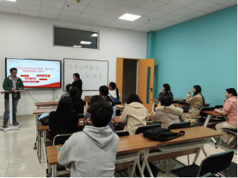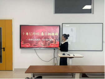 团支书段晓缤通过播放短视频《十月里的中国红》带领同学们回顾新中国成立、抗美援朝胜利等重大历史事件,感受十月的深厚历史底蕴。在红色故事分享环节,五位同学依次登台,生动讲述李大钊、刘胡兰等革命先辈的英雄事迹,引发强烈共鸣,现场气氛庄重而感人。
