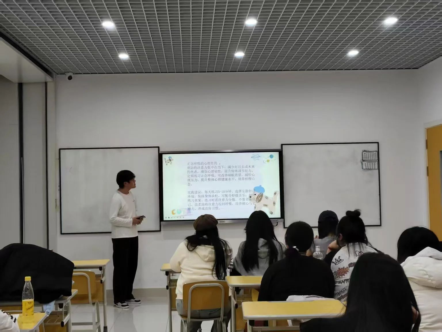 接着,在轻柔音乐的烘托下,主持人带领大家开始了一段宁静而放松的正念放松练习。大家微闭双眼跟随主持人的引导,专注当下,让思绪慢慢平静下来,杂念逐渐消散。练习结束后,主持人通过精心剪辑的视频,为大家讲解正念放松练习对减轻焦虑,增强心理韧性,改善情绪的诸多益处。
