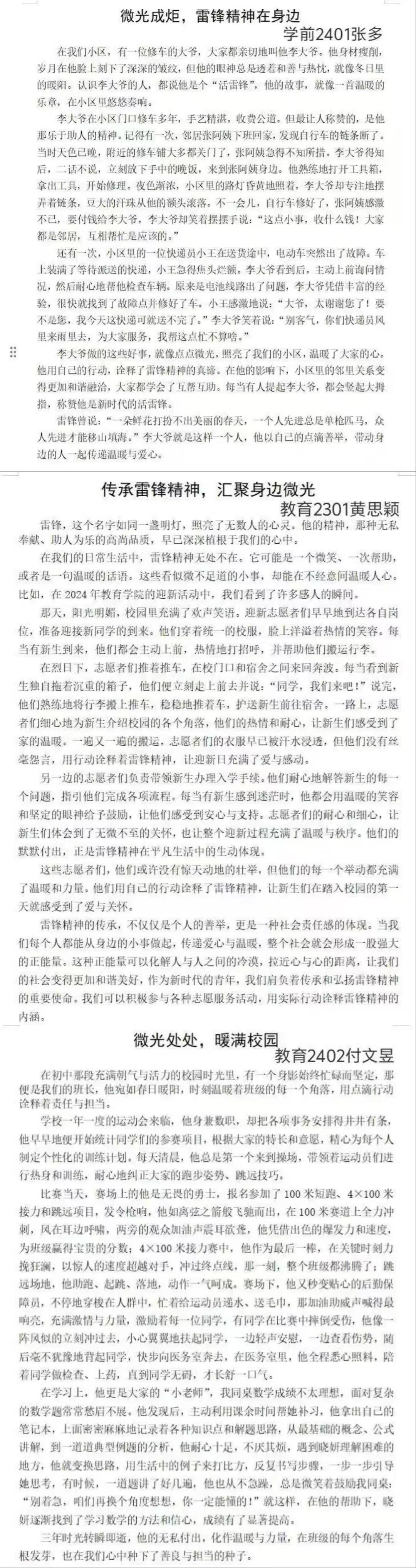 值此之际,教育学院积极响应号召,开展:“身边善举映微光,雷锋精神绽光芒—从红色伟人到身边榜样的雷锋精神传承”主题征文活动。其目的在于传递校园正能量,激发同学们对雷锋精神的认同感与践行热情,主动以雷锋精神为指引,规范自身行为,培养良好道德品质,让雷锋精神在校园扎根。