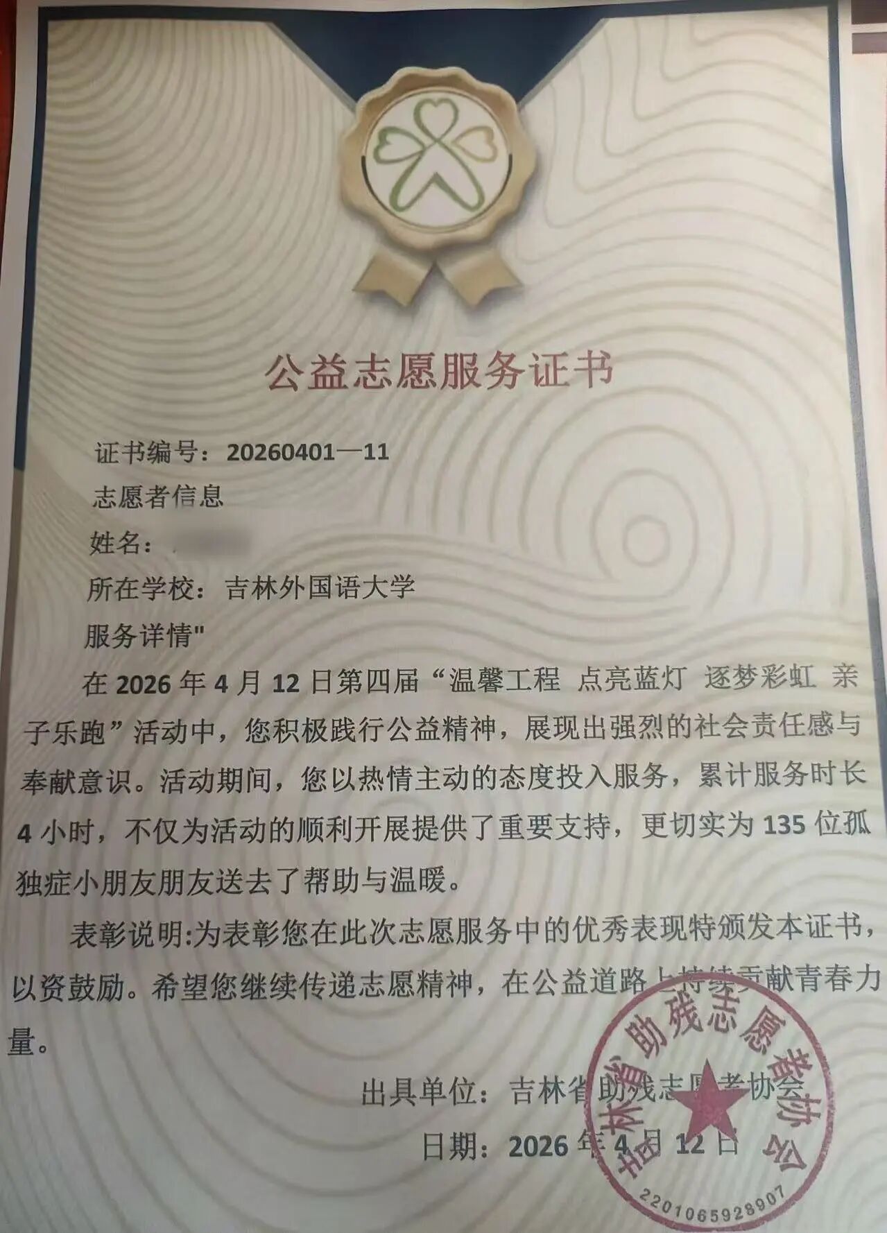 为助力第四届“温馨工程 点亮蓝灯 逐梦彩虹”关爱孤独症群体亲子乐跑活动顺利开展,用志愿服务传递温暖善意,教育学院青联组织志愿者,化身暖心服务者,全程驻守活动签到处,以细致周到的服务,迎接每一组爱心家庭,为这场温暖公益活动筑牢服务防线。